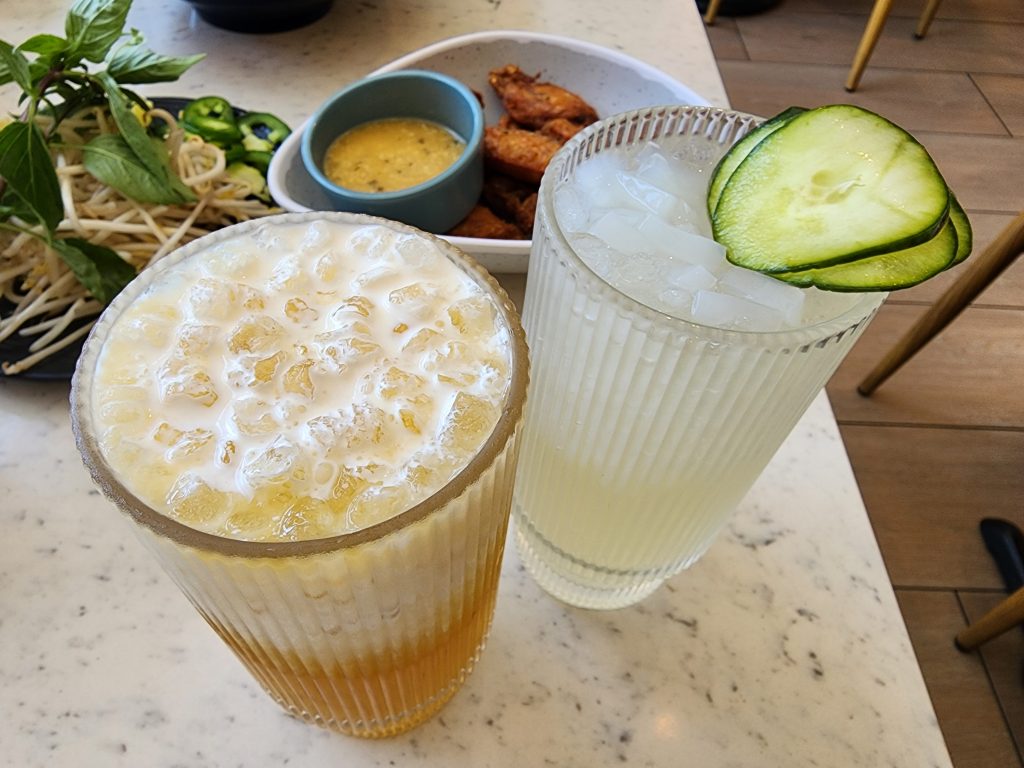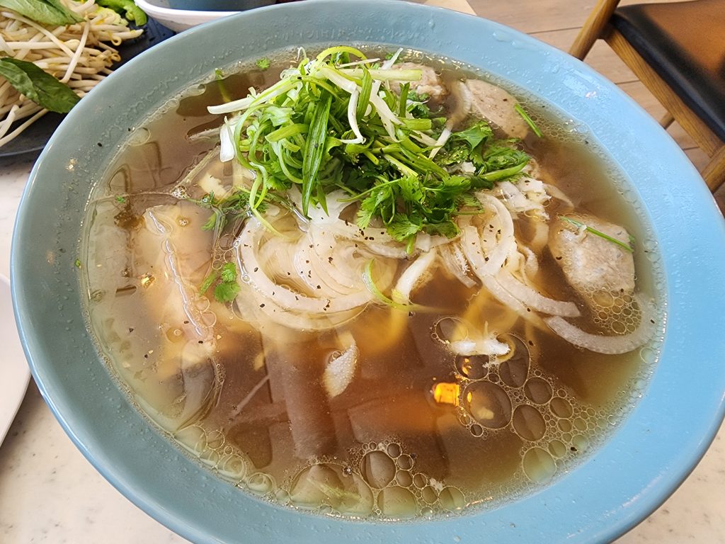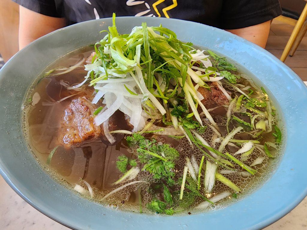 I’ve heard good things about Soup Shop’s pho. When I heard they reopened again in Cerritos, Tom and I went to give it a try. I ordered the sea salt cream with jasmine tea, and it was so refreshing. Tom ordered a cucumber limeade that he seemed to enjoy as well. We also ordered chicken wings since Tom likes chicken wings, and they were seasoned just nicely. I decided to get the combination pho to give everything a try, and Tom ordered an oxtail pho. Everything tasted so good. The tendon was seasoned and soft; the brisket was not too rough on the mouthfeel, and the meatball had good texture, too. I was not a fan of tripe, but I was surprised to see it since many places do not provide tripe anymore. Tom’s oxtails were so tender and fall of the bone, though. Definitely worth getting.