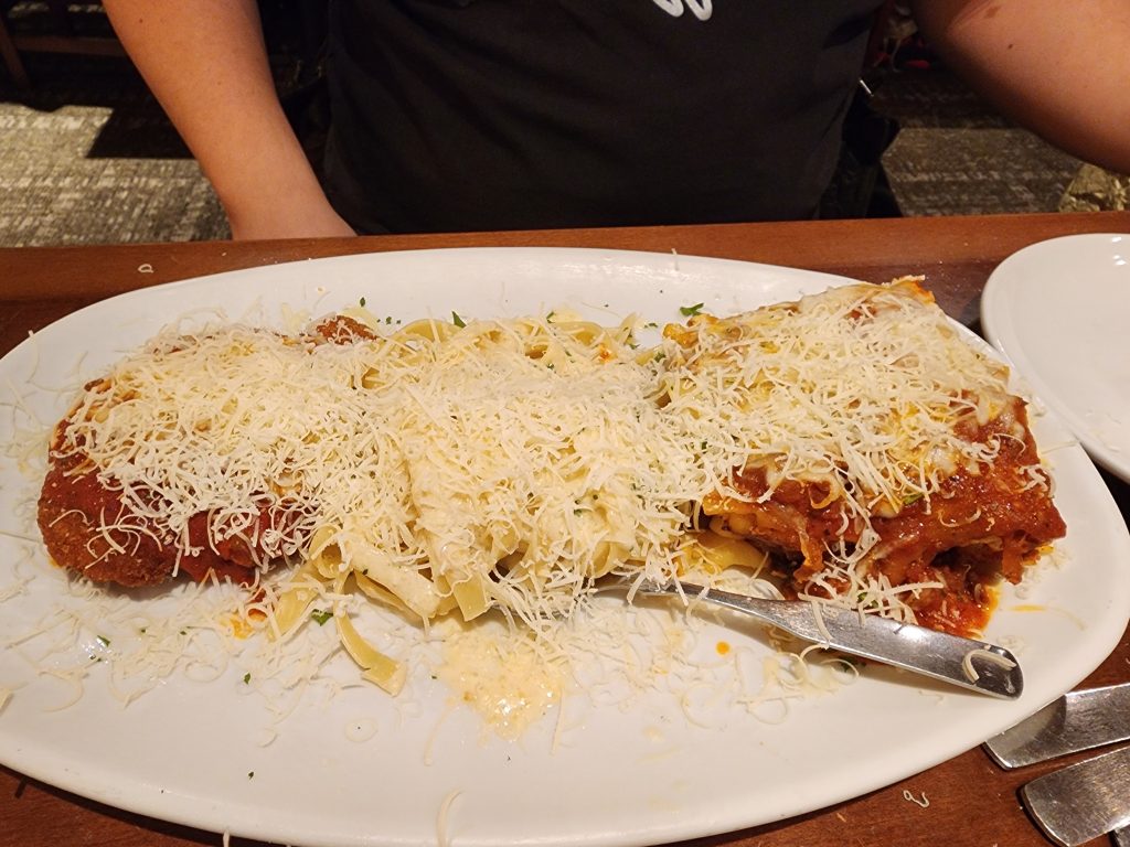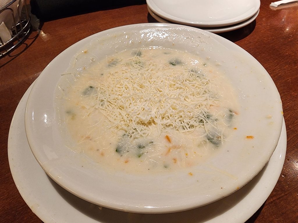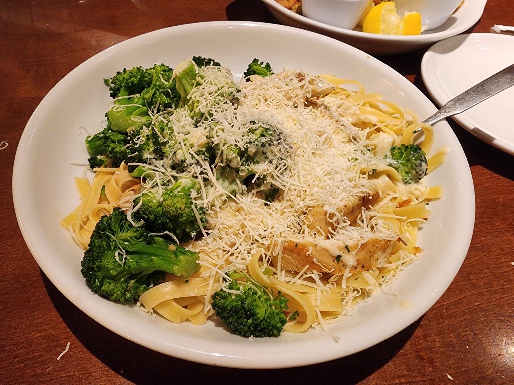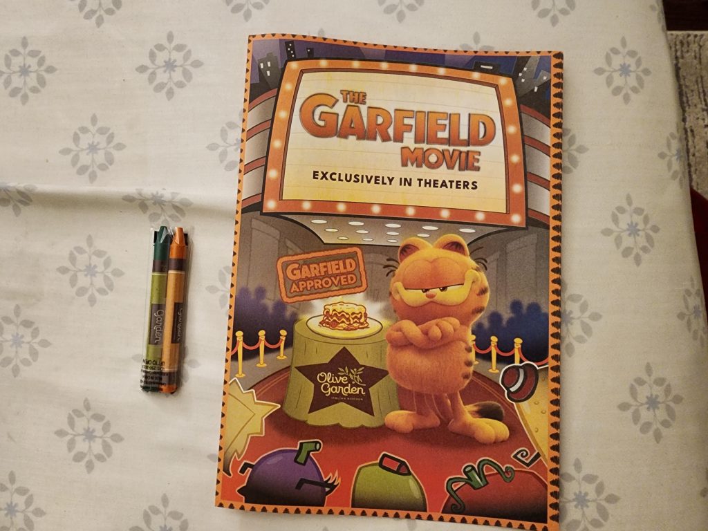 Garfield week continues. Tom and I went to Olive Garden on the opening night of Garfield because we thought it would be fun to go. I actually have not been to Olive Garden since I was in high school, so it was fun to go back to it again. There was not much promotion for The Garfield Movie, unfortunately, but I did ask for the coloring book they had for children. We ordered the chicken and gnocchi soup, the fried shrimp appetizer, the fettuccini chicken alfredo, and the Tour of Italy trio for Tom. The pasta itself was kind of on the mushy end, but I enjoy that texture, so I really liked my fettuccini chicken alfredo. Yes, I asked for broccoli as the side dish. I like my broccoli.