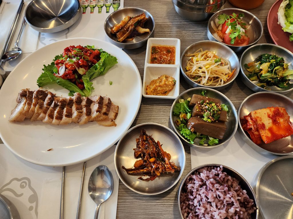 My coworkers Irene and Sharon said that there is a good Korean restaurant that opened near work, and they did not disappoint. I was impressed by the number of side dishes the restaurant had to offer, and it is not your common side dishes as well. I enjoyed the eggplant and the acorn jelly the most. We also ordered the pork belly, and it was so delicious. I would order it again.